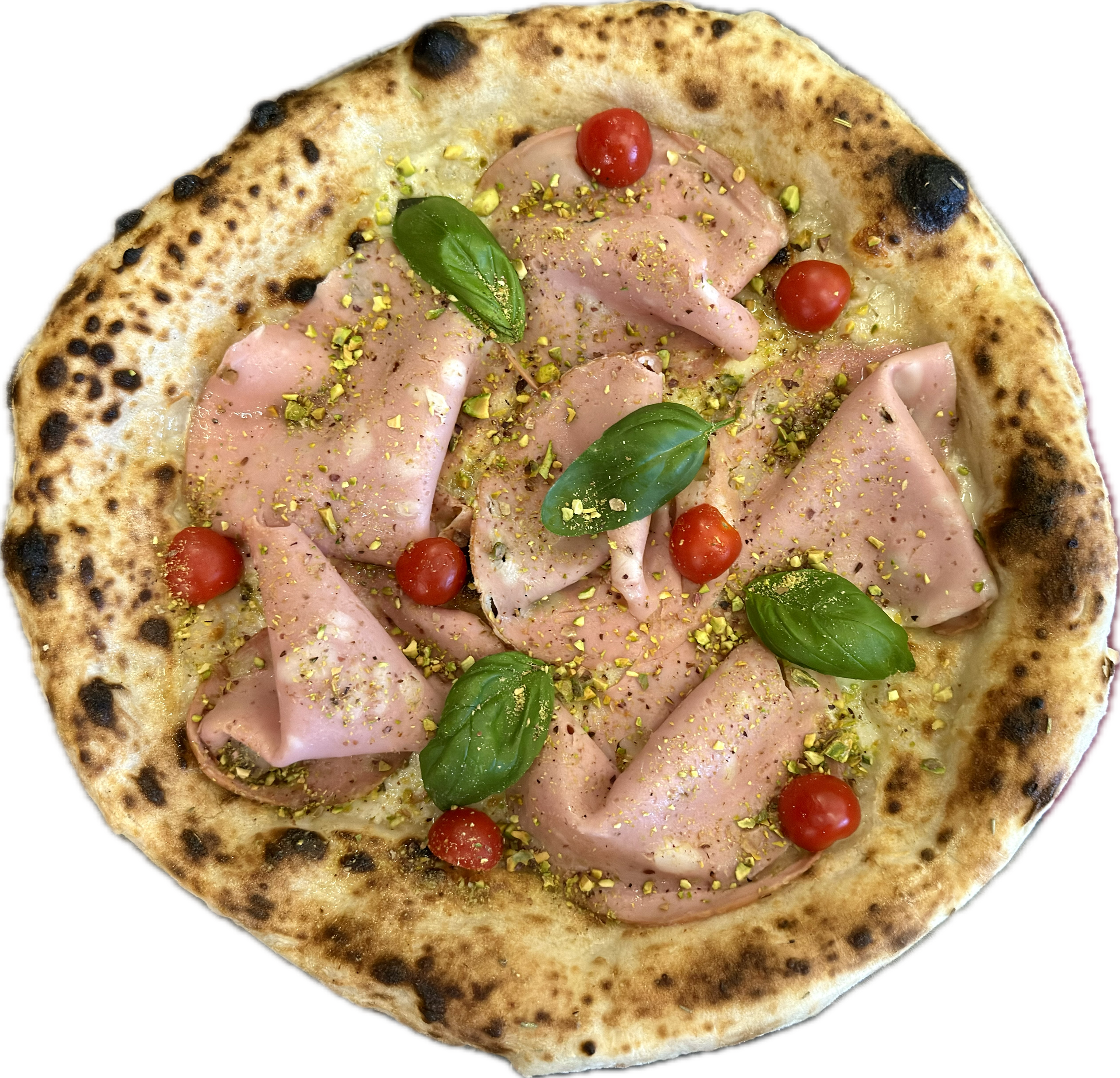 Parmezan, extra djevičansko maslinovo ulje, mozzarella (fior di latte), mortadela, svjež bosiljak, čeri paradajz, mrvljeni pistaći